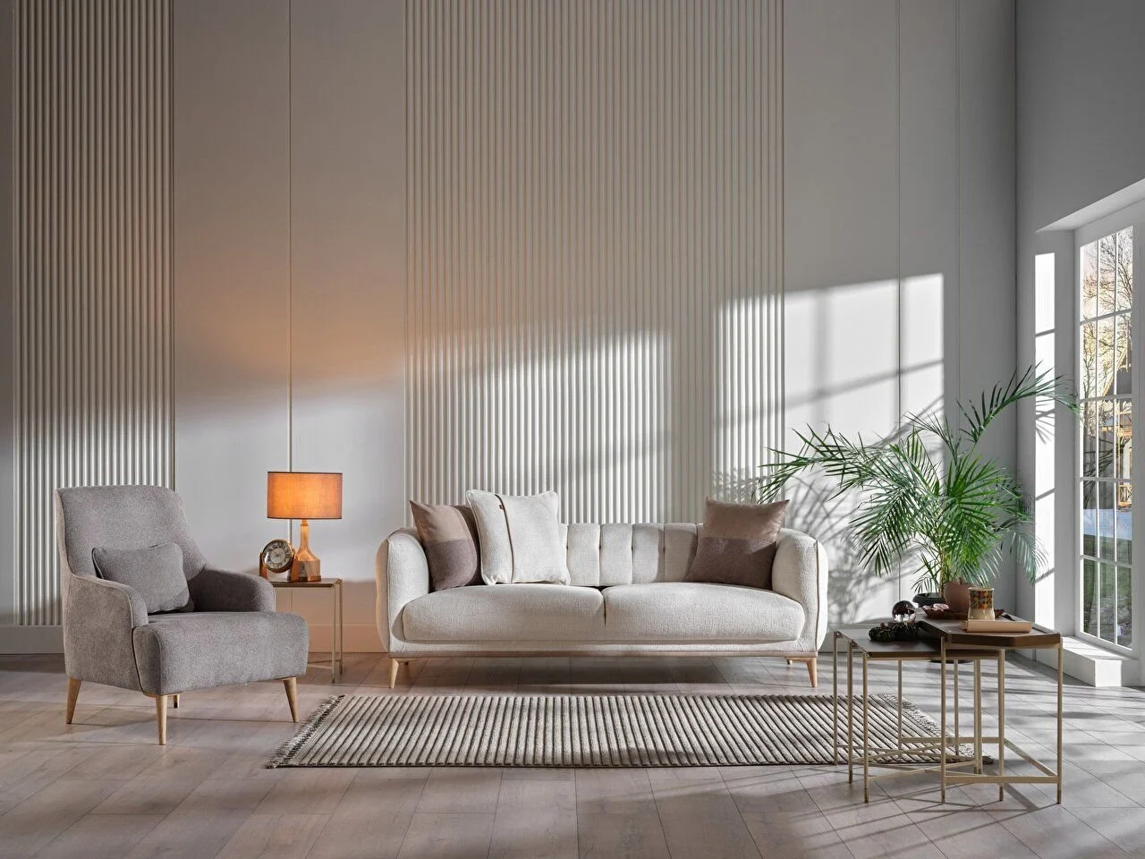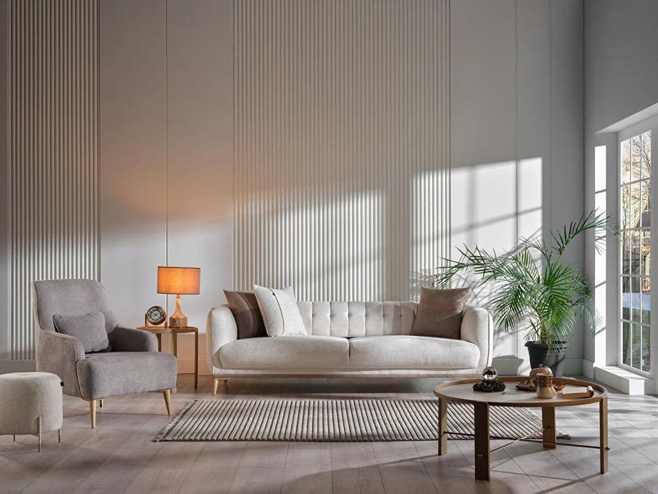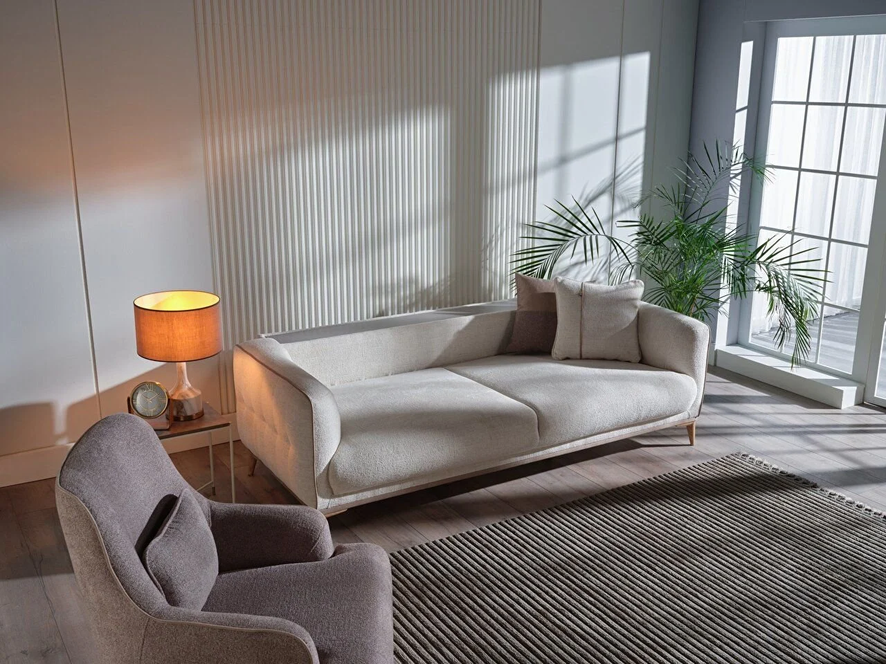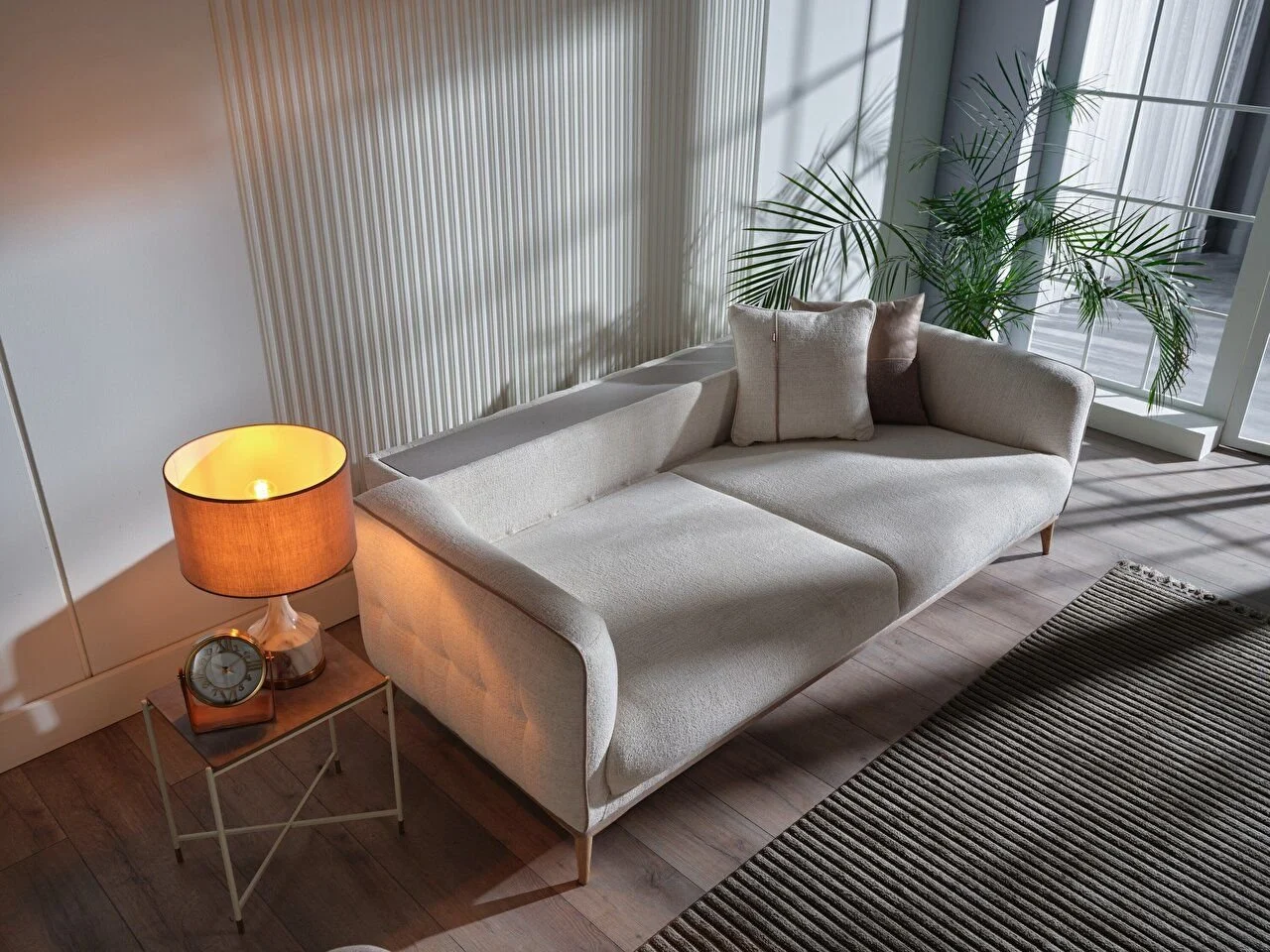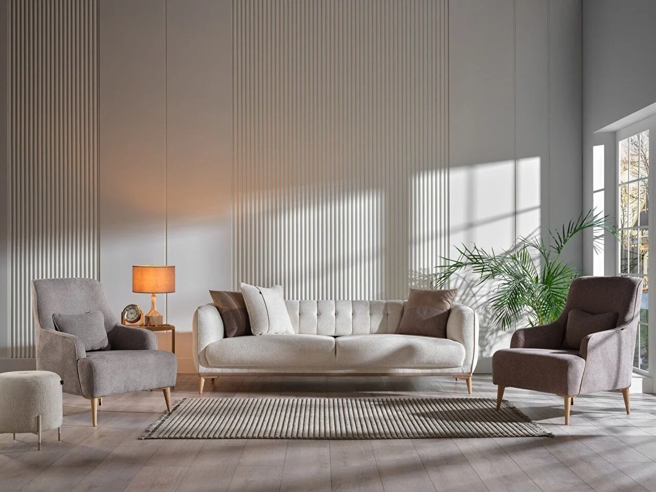 L’ensemble de canapés Mitra est un choix parfait pour ceux qui adoptent le style scandinave avec son design simple, élégant et confortable. L’harmonie du beige et du vison ajoute de la chaleur et de l’élégance à votre espace de vie.