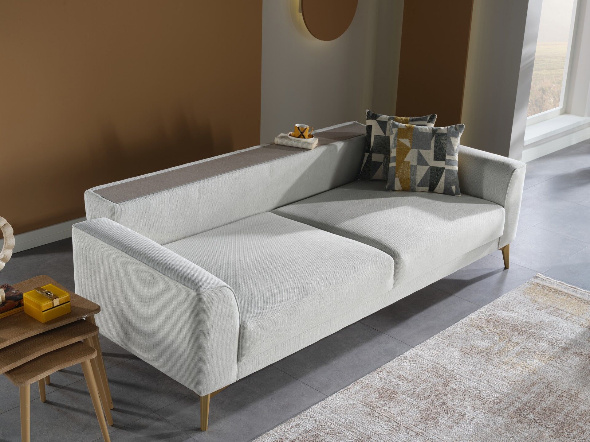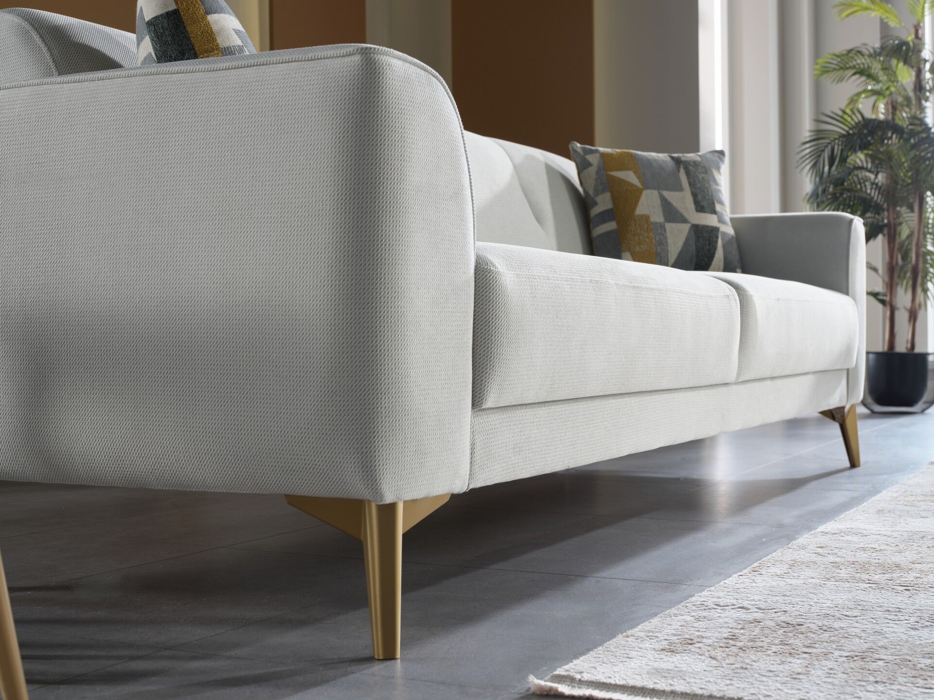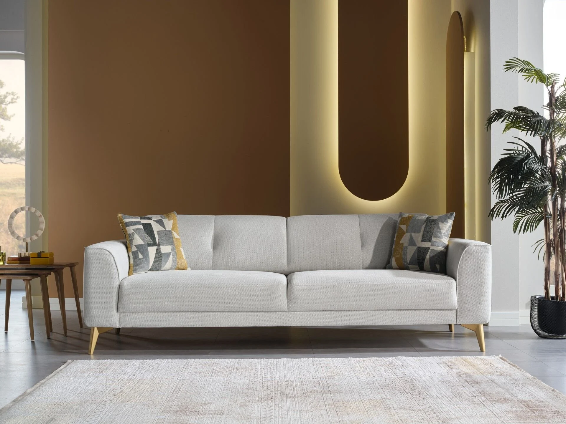 L’ensemble de canapés Lavita est conçu pour ajouter de l’élégance et de la modernité à vos espaces de vie contemporains avec ses lignes simples et ses détails élégants. Développé pour être compatible avec le meuble de salle à manger et de télévision compact Lavita, cet ensemble allie à la fois esthétique et fonctionnalité. Il offre une utilisation flexible pour chaque espace de vie avec ses unités triples, doubles et à ailes arrière. Le mécanisme qui bascule le dossier en unités triples offre une fonctionnalité supplémentaire en se transformant facilement en lit. Le tissu tricoté utilisé dans la combinaison se distingue par sa texture douce, sa durabilité et sa facilité de nettoyage. L’éponge souple 32 dns utilisée dans le groupe triple et l’éponge souple 28 dns utilisée dans le fauteuil assurent un excellent soutien même lors de longues séances. Trois alternatives de couleurs de pieds différentes, or, chêne et noyer, permettent de s’adapter facilement à différents styles de décoration. Il est fabriqué à partir de matériaux conformes aux normes E1, respectueux de la santé humaine et ne contenant pas de substances cancérigènes. L’ensemble de canapés Lavita ajoute une touche moderne à votre maison avec son design contemporain, son confort et sa fonctionnalité, tout en s’adaptant facilement à différents styles de décoration.