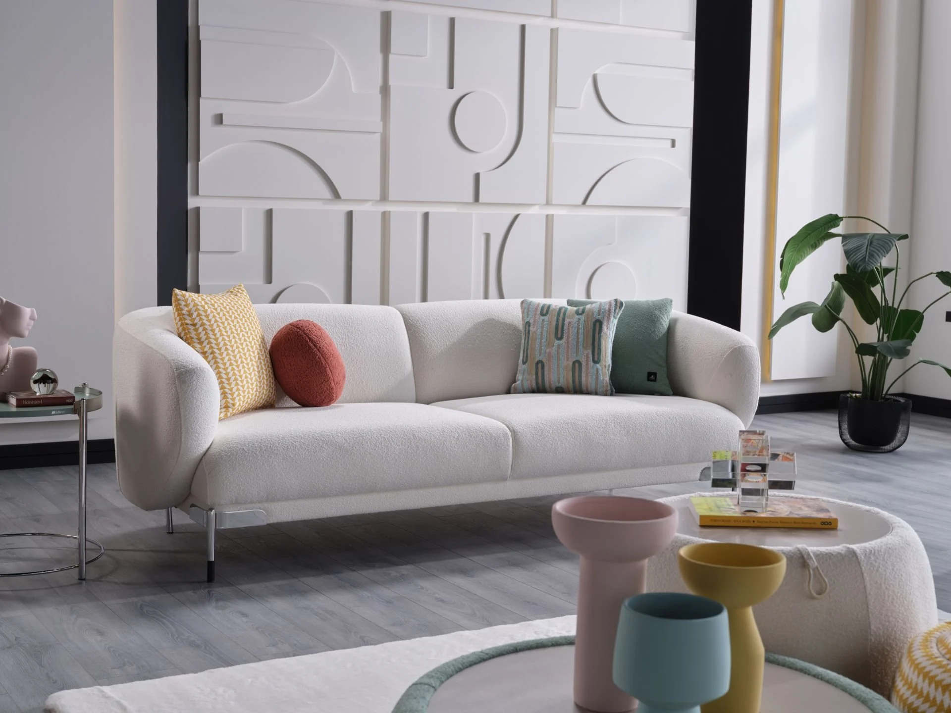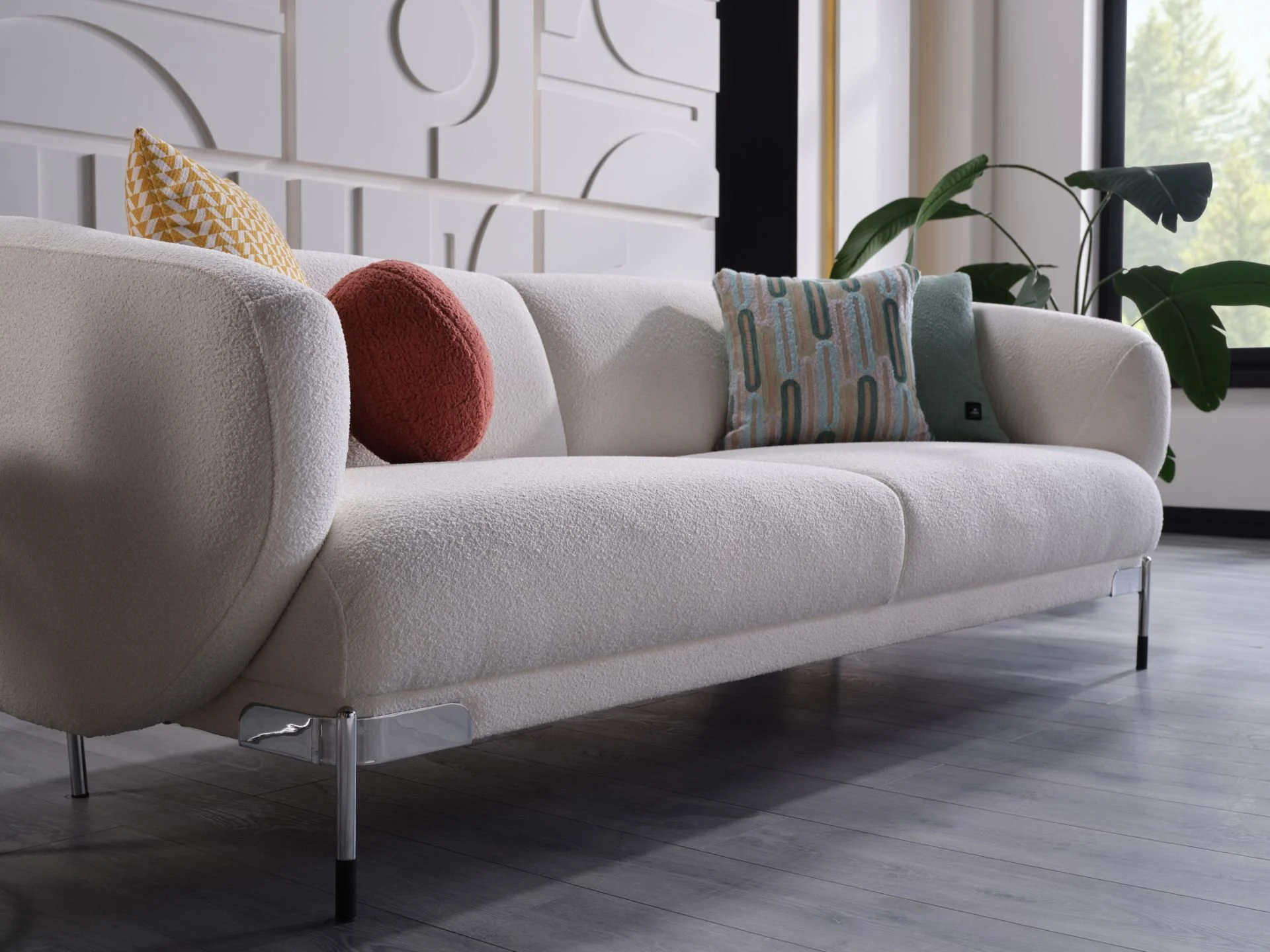 Les unités triples et doubles sont conçues comme des unités fixes et ne font pas office de lits. Le tissu Boucle, devenu incontournable dans l’industrie du meuble ces dernières années, est utilisé pour l’ensemble de canapés Lenor, offrant un toucher doux. Ce tissu, aux lignes épurées, complète le design et offre confort et élégance.