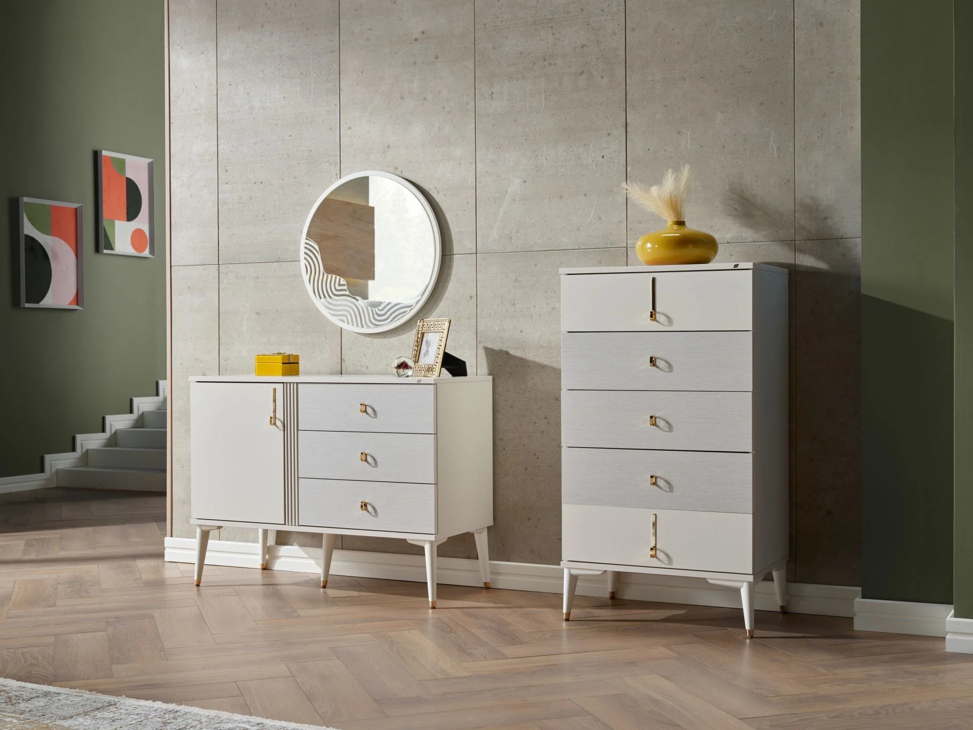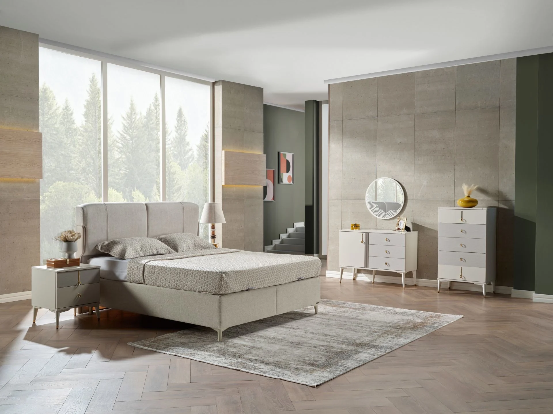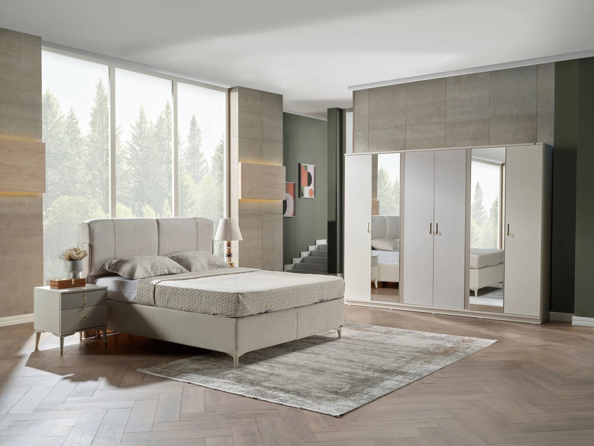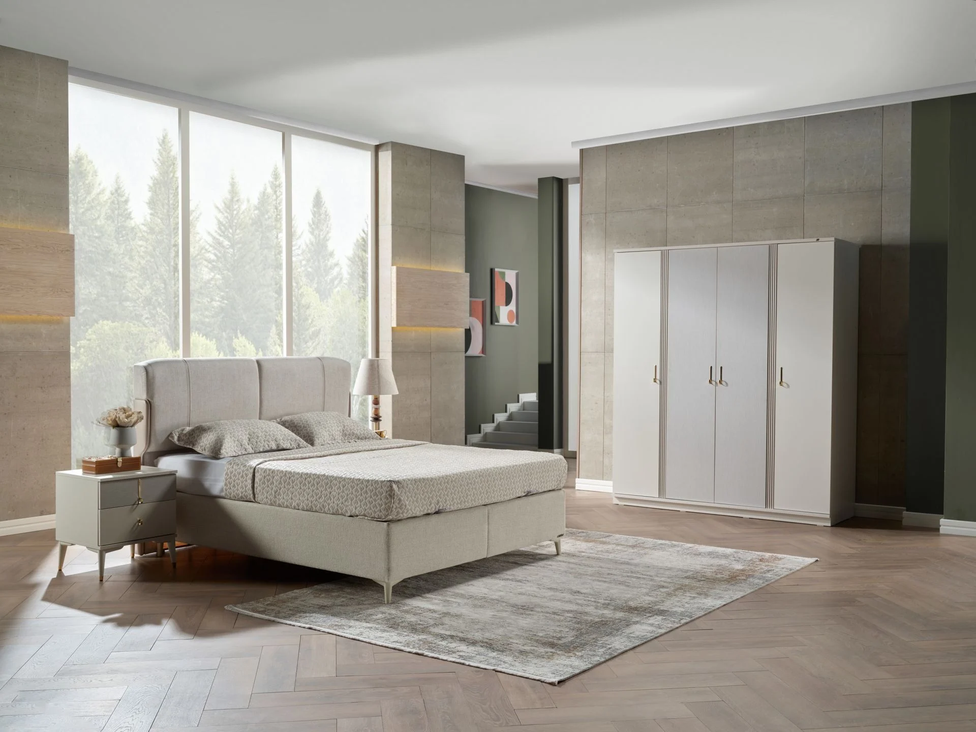 Contenu de l’équipe : Armoire (4 Portes) + Table de Maquillage + Miroir de Maquillage + Tête de Lit (150/160 cm) + 2 Tables de Chevet