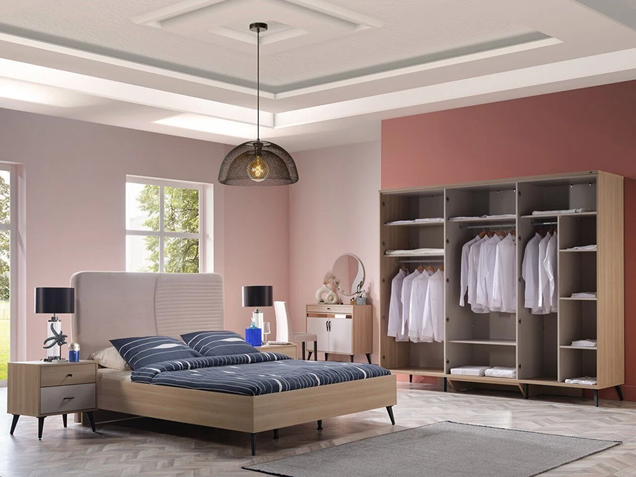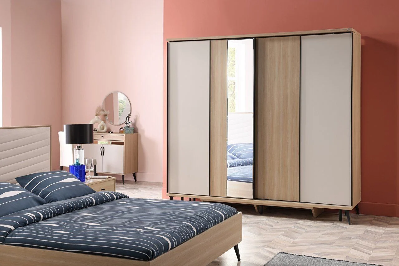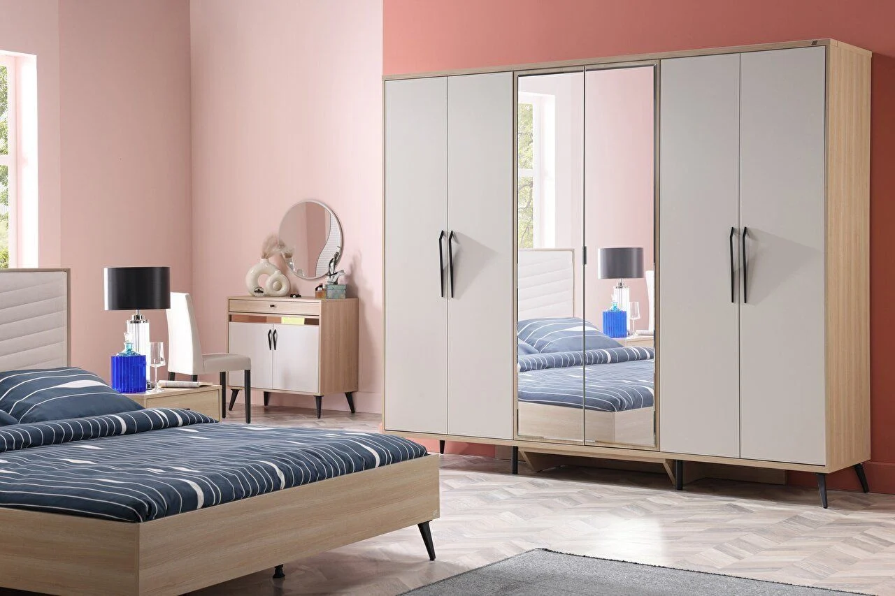 Contenu de l’équipe : Contenu du coffret recommandé : Il se compose de 1 armoire 5 portes + 1 table de maquillage + 1 miroir de maquillage + 1 tête de lit 150/160 + 2 tables de nuit. Lorsque le contenu du kit change, le prix total peut varier.