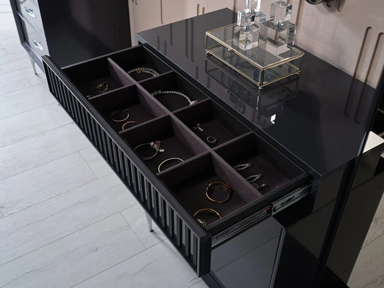 Fonctionnalité et confort : Viola Bedroom vous permet de vous exprimer de la meilleure façon possible avec sa table de maquillage différenciée. Le contrôle tactile de l’éclairage sur la coiffeuse vous aide à obtenir l’éclairage qui répond à vos besoins à tout moment. La fonction d’éclairage à l’intérieur du meuble facilite l’accès à vos affaires.