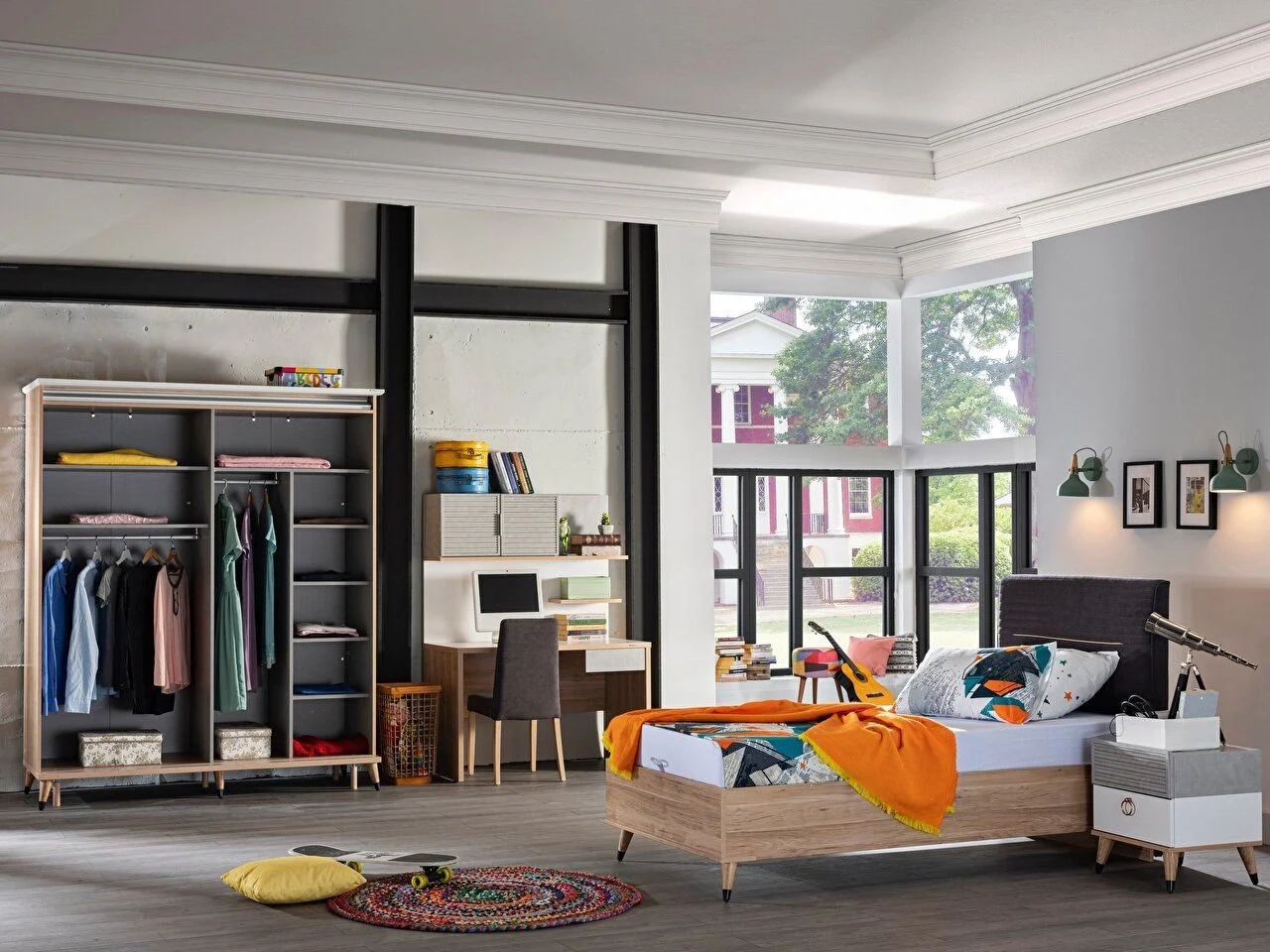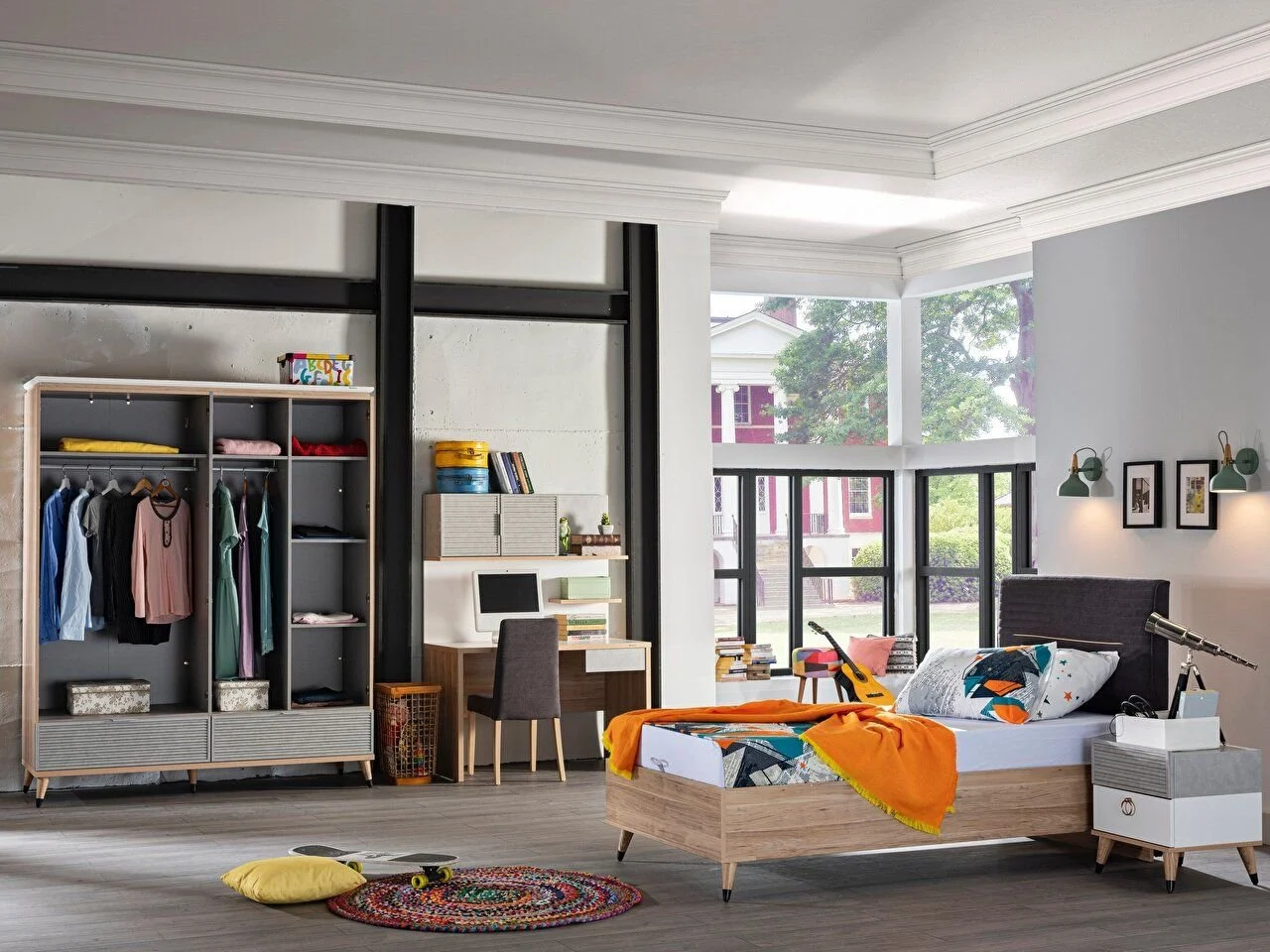 - Une approche de design élégante ajoute une atmosphère contemporaine à la chambre de l’adolescent.