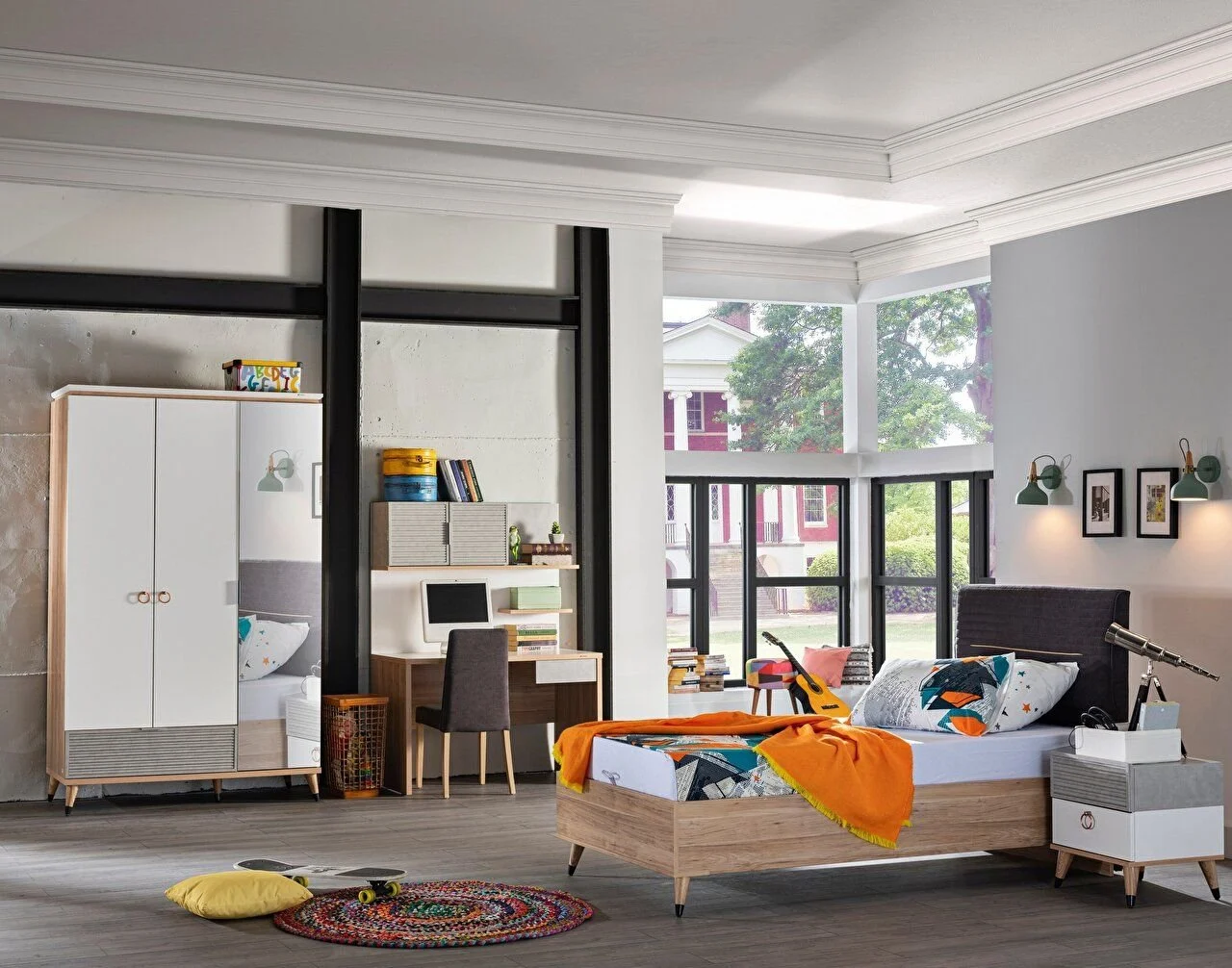 - L’ensemble de chambre Lena Youth séduit ceux qui souhaitent décorer leurs espaces de vie dans un style moderne avec l’harmonie du chêne et du blanc. Avec ses options de portes et d’armoires coulissantes et son alternative à trois lits superposés, cet ensemble allie élégance et fonctionnalité.