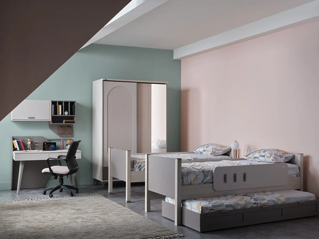 • L’ensemble de chambre Hera Youth se compose d’alternatives de garde-robe, d’une tête de lit, d’un lit, d’un bureau, d’une table de chevet, d’une commode, d’une bibliothèque et de lits superposés. Cet ensemble, qui augmente la fonctionnalité avec son module de lit superposé amovible et son détail de lit bas, allie confort et élégance dans la chambre de l’adolescent.