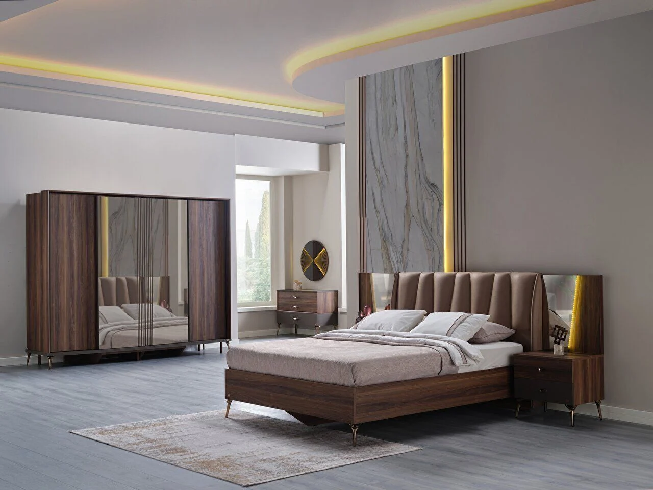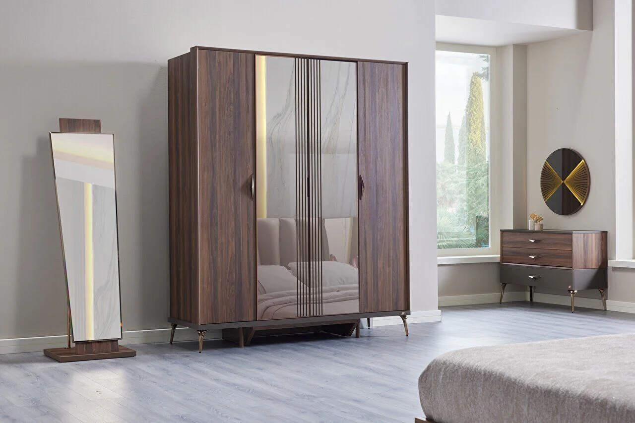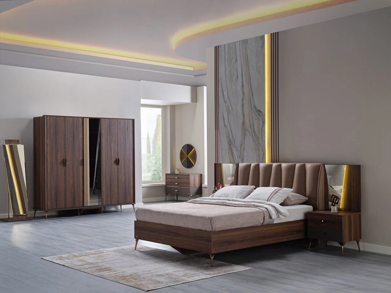 Armoire (4 Portes) + Table de Maquillage + Miroir de Maquillage + Tête de Lit (150/160 cm) + 2 Tables de Chevet