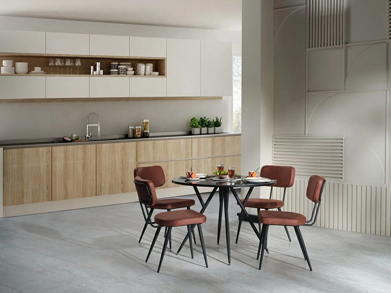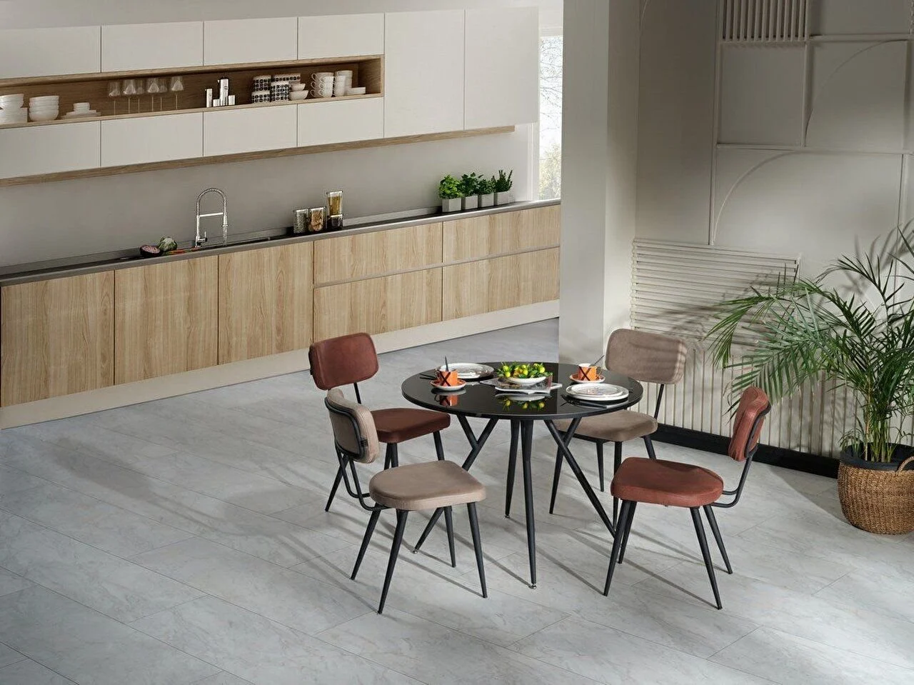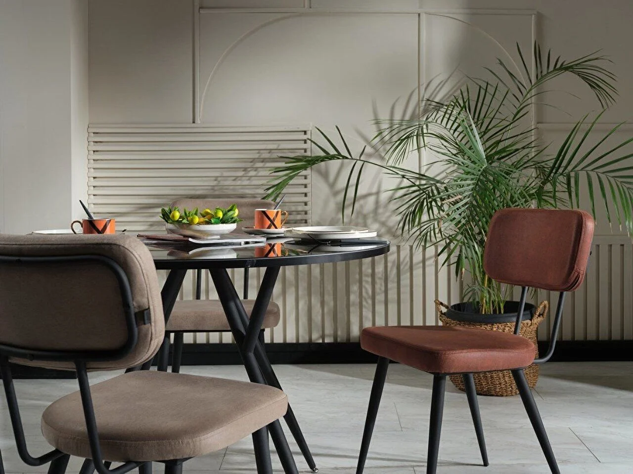 L’ensemble de table de cuisine Halley ajoute de l’énergie à votre cuisine avec son design sportif et moderne. La forme table ronde et les chaises couleur carrelage et vison disposées autour apportent élégance et vivacité à votre cuisine. Les chaises dans les tons vison et brique associées à la table noire créent des contrastes élégants, créant une atmosphère moderne.