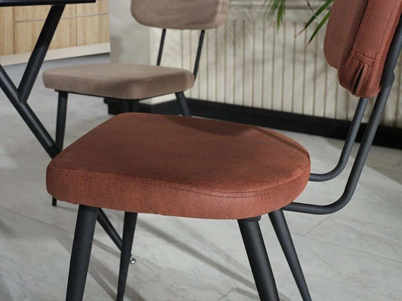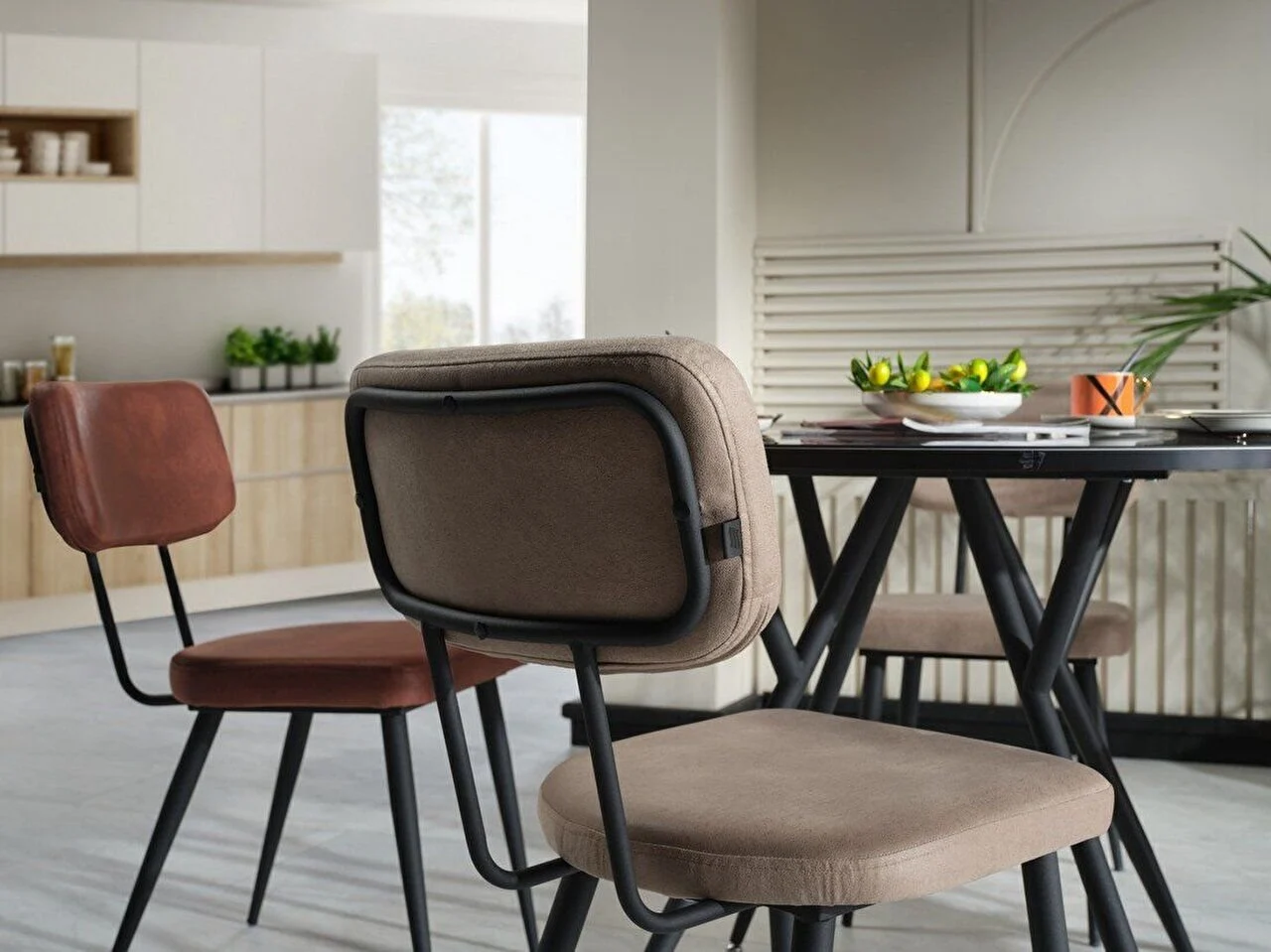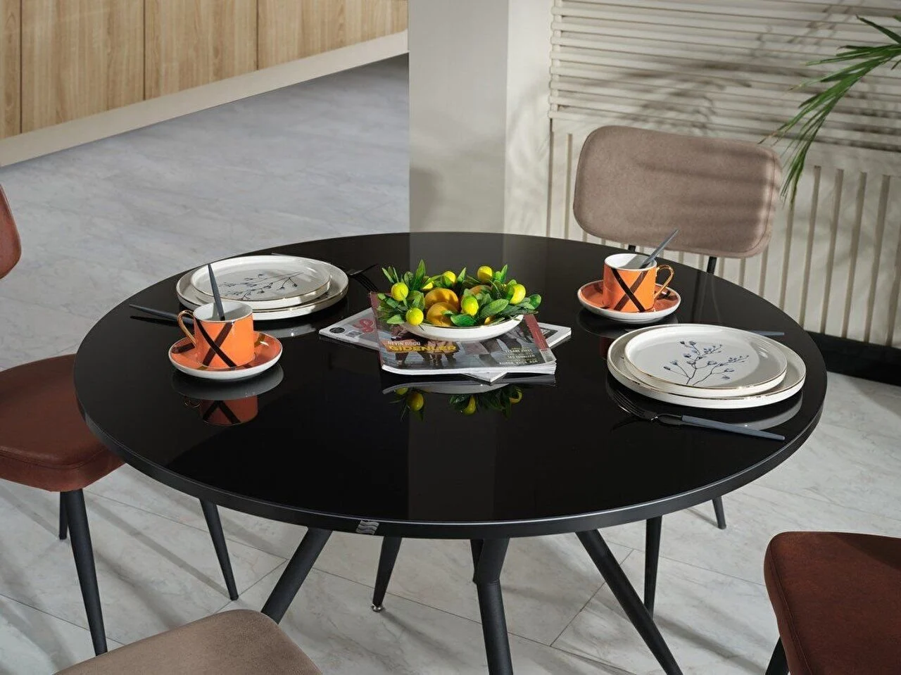 L’ensemble de table de cuisine Halley ajoute de l’énergie à votre cuisine avec son design sportif et moderne. La forme table ronde et les chaises couleur carrelage et vison disposées autour apportent élégance et vivacité à votre cuisine. Les chaises dans les tons vison et brique associées à la table noire créent des contrastes élégants, créant une atmosphère moderne.
