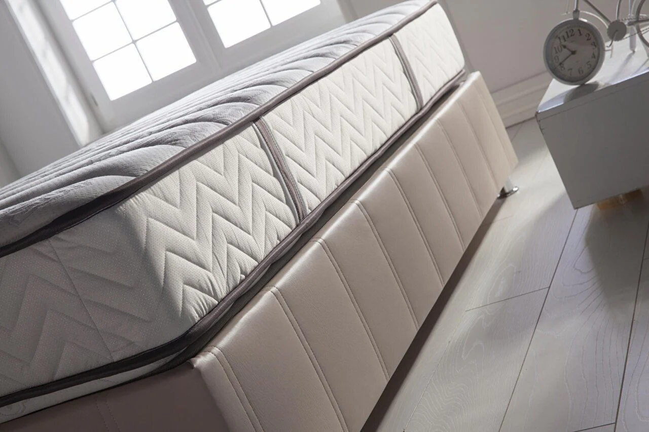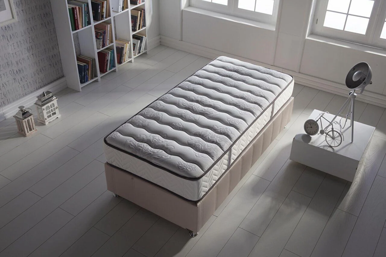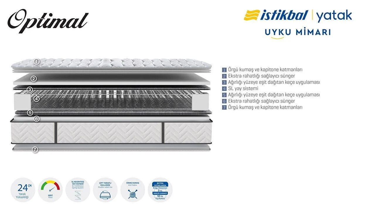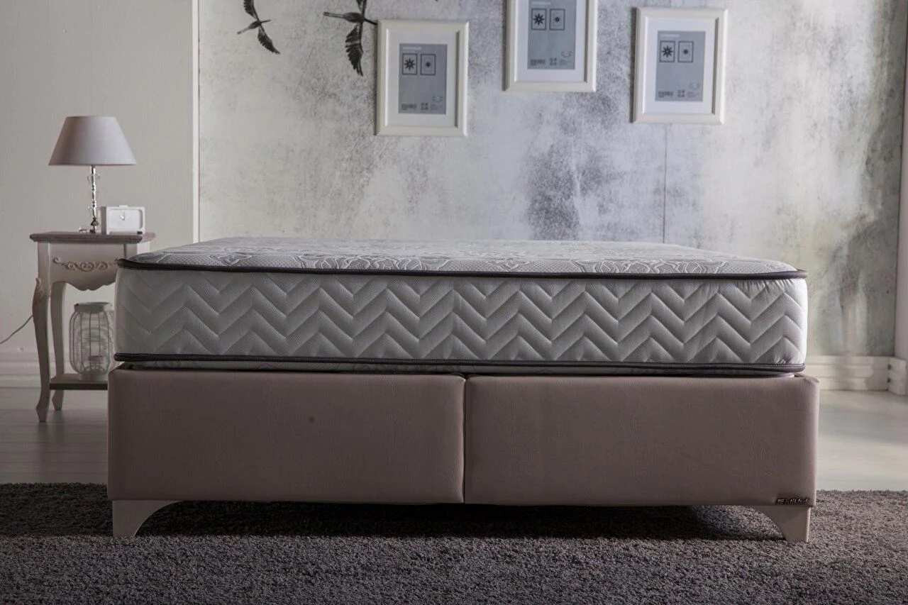 de sommiers , offre un confort unique grâce à son tissu tricoté spécial. Le feutre dur Thermofelt sur le matelas garantit que le poids est réparti uniformément sur toute la surface. Il offre un sommeil confortable et fiable grâce à la fibre utilisée. Le cadre à ressorts, spécialement traité thermiquement contre la déformation, et la plaque en éponge qui augmente le confort, prolongent également la durée de vie du matelas.