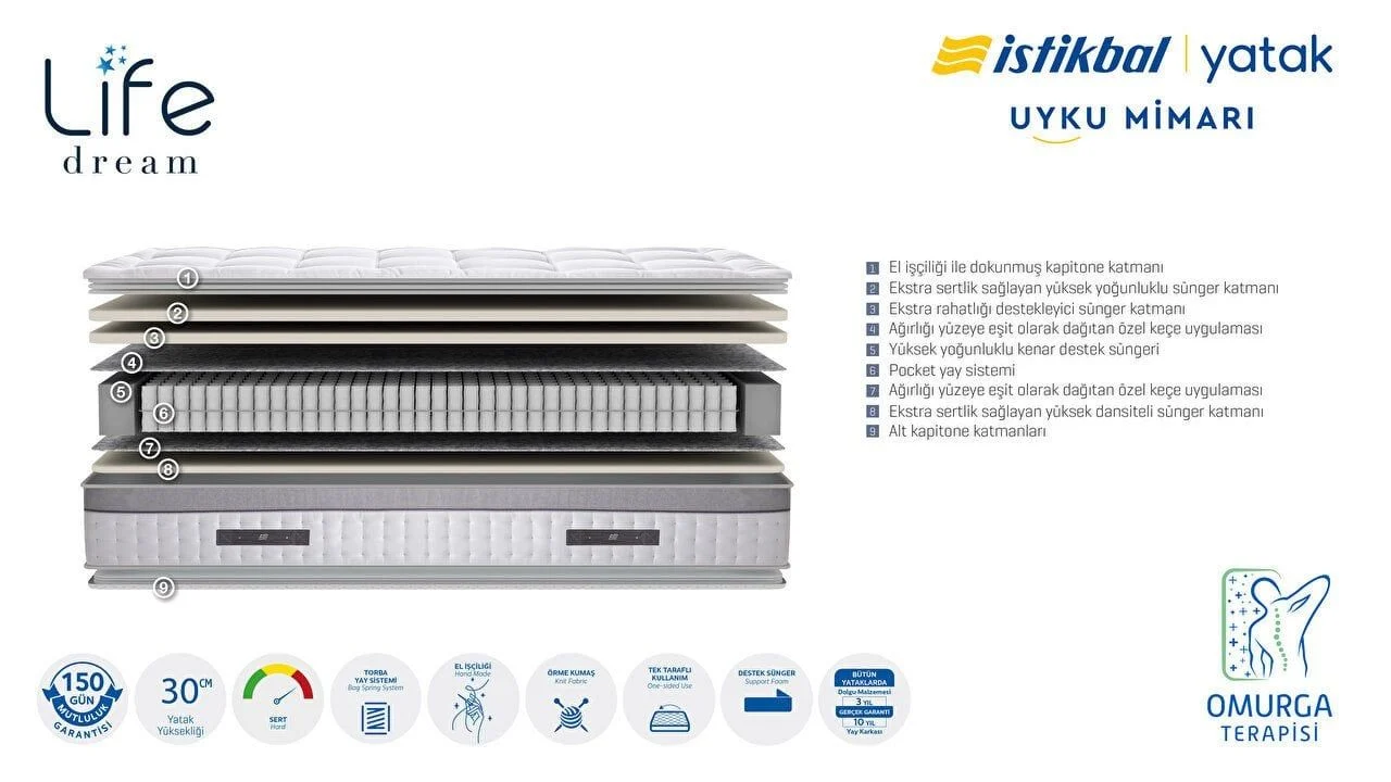 Spine Therapy, offre un soutien optimal au corps grâce à ses ressorts ensachés, protège la courbe naturelle du dos en équilibrant le poids du corps et s’adapte à la colonne vertébrale. Le tissu supérieur de notre lit est fabriqué à la main et conçu pour être utilisé pendant les quatre saisons. Conçu pour nos consommateurs qui préfèrent les lits durs, notre lit est adapté à un usage simple face.
